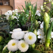Wir haben SALATJUNGPFLANZEN und HORNVEILCHEN und eine AUSWAHL AN FRÜHLINGSBLÜHERN.